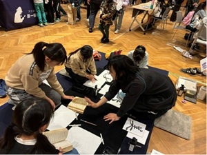 最初に書道家養成プログラムに従って「漢字」の成り立ちについて学びます。その後、自分の書道作品を制作します。みなさん思い思いの漢字を辞書で調べて練習し、それぞれの個性が醸成された素晴らしい作品が出来ました。